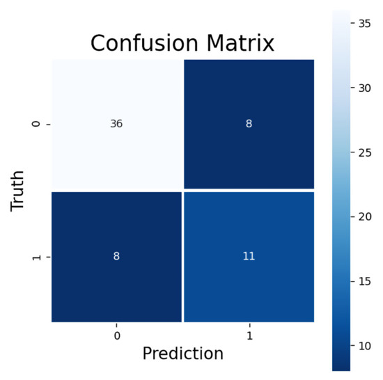 The model trained to predict ORR had a promising LOOCV performance with all four metrics: accuracy, AUC, F1 score, and MCC. The accuracy of predicting ORR was 75%. The AUC value (0.71) suggests a decent quality level of model performance. The F1 score (0.58) indicates that the model was feasible in predicting the treatment response, which was supported by the MCC value (0.40). In the confusion matrix for all 63 LOOCV ORR predictions can be seen a rather good sensitivity (0.58) and a high specificity (0.82) of the model (Figure 2). The false negatives (8/63 samples) were identified as the cases where the prediction model did not predict a presence of objective treatment response for a test dataset sample which was a true positive, i.e., CR or PR was present. The false positives (also 8/63 samples), on the other hand, were the cases where the model predicted the presence of CR or PR for the sample but the sample was a true negative, i.e., the response was SD or PD.