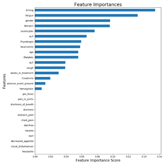 Figure 3 illustrates the feature importance from a model trained with all available samples (n = 63). The displayed importances depict the relative average improvement in prediction accuracy across all of the 100 decision trees in the model where a certain feature is utilized. The importance of each feature should be considered as relative to the others. As is presented in Figure 3, the two most important features for predicting the ORR were itching and fatigue. Figure 3 reveals that roughly half of the features contributed to the predictions. The features which do not contribute to the predictions could be removed from the prediction model using feature selection, but it does not impact the model performance, due to the tree structure of the used gradient boosting algorithm.