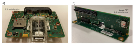 The hard disk drive itself, however, did not support the optical OOB mode, and was restricted to electrical OOB, which inserts electrical idles of defined periods onto the high-speed link, making it unsuitable for direct connection to an optical transceiver. For this purpose, a six-port SAS expander was provided to serve as a bridge between the classical OOB of the disk drive and the optical OOB required to convey the signal through an optical transceiver. Although one dual-channel optical transceiver was sufficient to fully convey the two bidirectional links between the disk drive and the midplane, a second dual optical transceiver was added to serve as an auxiliary link, as shown with dashed lines in Figure 9a. In order to use this transceiver, the six-port SAS switch would simply need to be configured to convey the auxiliary links to the disk drive. The top and bottom sides of the optical interface card are shown in Figure 10b,c respectively.