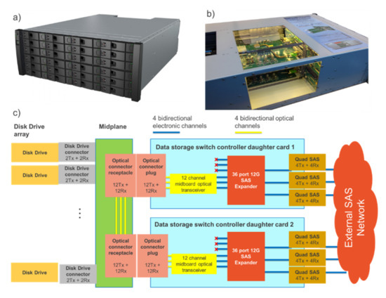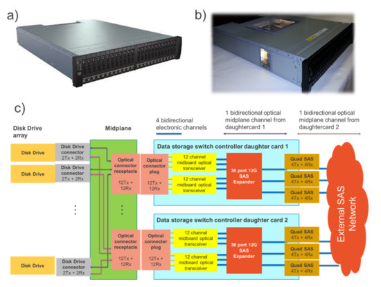 The LightningValley system (Figure 4b) was adapted from a 4U24 OneStor data storage array platform (Figure 4a). The system enclosure is 4U (177.8 mm) high and 19″ (482.6 mm) wide and supports an array of 24 3.5″ hard disk drives, which gives rise to the prefix 4U24. The LightningValley platform was modified to allow 12 bidirectional 12 Gb/s SAS channels to be conveyed optically from the expander chip of one controller daughtercard across an optical bridge on the midplane to the expander chip of the other controller daughtercard in the system (Figure 4c).