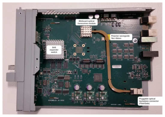 - Schmidtke, K.; Flens, F.; Worrall, A.; Pitwon, R.; Betschon, F.; Lamprecht, T.; Kraehenbuehl, R. 960 Gb/s optical backplane using embedded polymer waveguides and demonstration in a 12G SAS storage array. In Proceedings of the 2013 Optical Interconnects Conference, Santa Fe, NM, USA, 5–8 May 2013; pp. 29–30. [Google Scholar] [CrossRef]