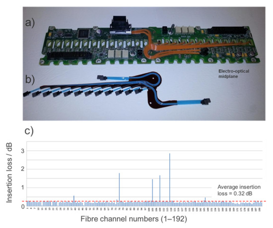 Insertion loss measurements were carried out on the polymer waveguide flex using an 850 nm VCSEL test light source. The reason for this is that all commercial midboard transceivers deployed in the reported systems use 850 nm VCSELs, which are high-volume commodity items. The 850 nm VCSEL test source was connected to a 5 m multimode graded-index optical fiber of category OM3 with a core size of 50 µm. The fiber was wound 10 times across a 50 mm diameter mandrel to produce a normalized modal launch condition. The full optical link path shown in Figure 5 is described as follows: