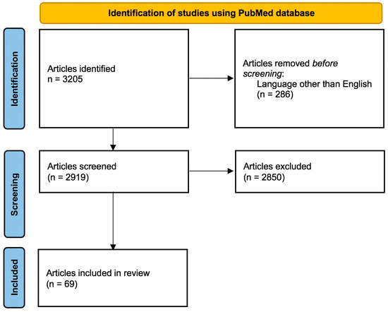 A systematic review of the MEDLINE database was performed for articles published between 2011 and 2021 containing the terms “loosening hip”. We included meta-analysis, randomized controlled trials, reviews, and systematic reviews. The authors reviewed the abstract of each article and only English-written articles were considered. All studies involving preoperative, intraoperative and postoperative factors that affect aseptic loosening in cementless total hip arthroplasty were included. More specific, implant properties (design, material, bearing surfaces), surgical factors, patient-related factors (comorbidities, demographics, genetics, habits), postoperative protocol (activities, weight-bearing), and use of perioperative drugs (antiosteoporotic drugs, opioids, statins, beta-blockers) were all included in our review. Studies on the aseptic loosening of both the acetabular component and the femoral stem were taken into account. Regarding the exclusion criteria, studies where only physiopathology, diagnosis or treatment of aseptic loosening were addressed were not included in our review. Moreover, only studies performed on cementless primary total hip replacements were included, while loosening of mega-prosthesis, hip revisions, hemiarthroplasties or hip resurfacing were not considered. The PRISMA flowchart is available in Figure 1.