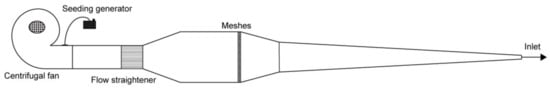 The experimental setup used for flow testing in a channel with one rough wall consisted of a single radial fan, a section designed to equalize the flow and a measuring channel. Due to its size, the experimental setup is presented in two figures: Figure 1 and Figure 2. The radial fan, with inverter-controlled rotational speed, supplied air into the flow equalization section consisting of the following elements: a straightener, a diffuser with two rows of grids, and the first and second confusor connected with the measuring channel (Figure 1).