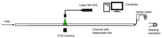 Numerous initial tests were carried out prior to conducting the actual measurements. Optimal measuring conditions were determined on the basis of these tests and defects of the test station, e.g., a local leak of the channel, were identified and removed. It was ascertained that the length of the test station was sufficient for obtaining the required development of the velocity profile. During each of the measurements, the air velocity in the channel was controlled with a Pitot tube installed at the outlet and connected to a TSI Incorporated, Minnesota, USA Airflow meter. The Reynolds number, based on height H = 0.02 m and the average velocity in the initial, i.e., smooth section of the channel, was Re = 32,500.