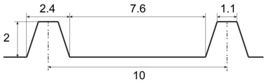 The 1.2 m long measuring channel with a 0.20 m × 0.02 m internal cross-section was made of mineral glass. The top wall and the side walls were smooth along their entire length, whereas the bottom wall was smooth only along its initial (0.14 m) and its final (0.1 m) sections. Along its remaining length, the bottom wall featured periodic roughness in the form of evenly spaced, isosceles trapezoid shaped ribs positioned crosswise in relation to the direction of the flow. The ribs represented a simplified laboratory model of ribbed, arched supports used in mining longwall workings. The dimensions of the ribs (in millimeters) are presented in Figure 3.