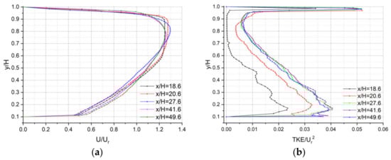 At y/H height ranging from 0.6 to 0.9, the profile of the streamwise velocity component obtained at distances x/H = 18.6 and x/H = 20.6 is almost flat. The profile becomes more convex with increasing distance from the inlet. The profiles at distances of x/H = 27.6 and 41.6 matched each other. This meant that turbulent flow was fully developed for x/H between 27.6 and 41.6. The profile measured at x/H = 49.6 differed from the remaining profiles, as it was close to the outlet of the measuring channel. The profiles of normalized turbulence kinetic energy (TKE) were consistent at x/H 27.6 and 41.6.
