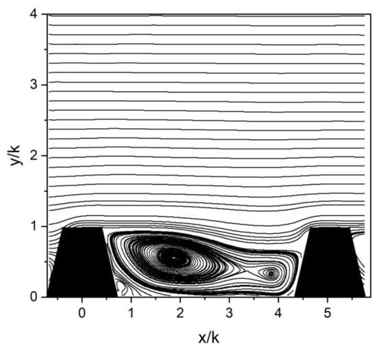 Figure 5 presents averaged streamlines. The flow detaching along the top edge of the rib forms a zone consisting of two minor vortices with identical rotation direction in the cavity. The center of the vortex is located at x/k = 1.9, y/k = 0.6 distance at the windward rib and at x/k = 3.9, y/k = 0.4 distance at the leeward rib.