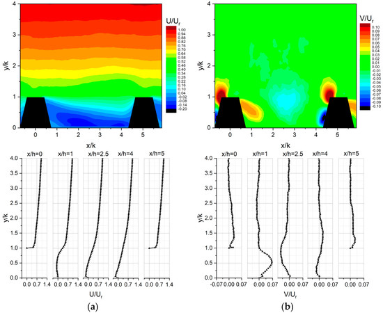Figure 6 presents scalar maps and profiles of streamwise U and transverse V velocity components at x/k distances equal to 0, 1, 2.5, 4 and 5. The profiles of the U velocity component obtained over the ribs at x/k = 0 and x/k = 5 are almost identical. Due to the presence of vortices in the cavity, the U component between the ribs has a negative value for x/k = 1 at the height y/k = 0.7, for x/k = 2.5 at the height y/k = 0.5 and for x/k = 4 at the height y/k = 0.35. The presence of the recirculation zone is also visible in the distribution of the V transverse component. A shearing layer and local acceleration occur over the rib.