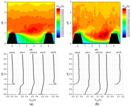 Figure 7 and Figure 8 present statistical values that accompany the turbulence, such as Reynolds stress and turbulence kinetic energy. The results in the direct vicinity of the edge carry a significant uncertainty. Figure 7 presents rms (root mean square) velocity values (Urms and Vrms). Except at the top of the ribs, the maximum Urms values occurred near the middle of the distance between the ribs at the height y/k = 1.2. Similar results were obtained through simulations by Cui et al. [8] with the maximum Urms value identified closer to the leeward rib. The maximum Vrms values were obtained for x/k equal to 3.2 at the height y/k = 0.75. The results of Urms and Vrms components are qualitatively consistent with the results obtained by Stoesser et al. [12].
