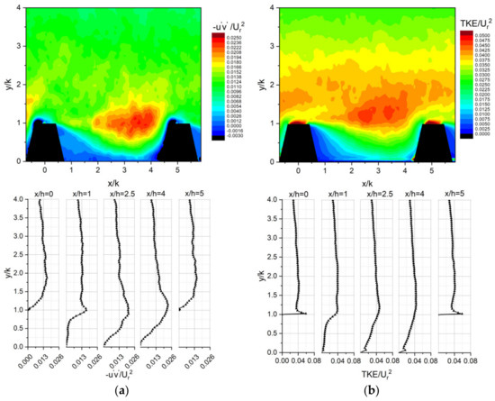 Figure 8 presents average, normalized, turbulent shear stress −u′v′ and the turbulence kinetic energy (TKE). The shearing layer forming over the rough elements is clearly visible (the red area) on the outline of the −u′v′ shear stress. The maximum values of turbulent shear stress were obtained at the x/k distance equal to 3.5. The zone of high values of turbulence kinetic energy overlaps to a large extent with high values of turbulent shear stress. Mass and momentum transfer occurs between the cavity and the zone present over the roughness, with the highest intensity for x/k ranging from 2 to 4.