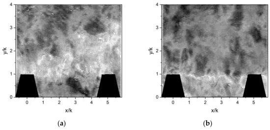Vortices are generated in the shearing layer as the stream detaches from the top edge of the rib. Galileo’s decomposition is one of the methods of the visualization of non-stationary vortices [14]. The total velocity U can be expressed as sum of convection velocity Uc and deviation uc. Galilean transformation removes a constant that is independent in space and time. When convection velocity matches vortices velocity, it becomes visible as a circular pattern of velocity vectors. Two reference velocities were removed from velocity vector field equal to 0.5 and 0.86 of the Ur velocity, respectively. There are several vortices coming off of the windward rib visible in Figure 9a. The visualization shows that multi-scale vortices are present in the shearing layer. These have the size of approx. 1/3–1/2 of the rib height. The angle between the path of the vortices and the x axis is ca. 25°. Figure 9b shows three vortices between the ribs, of the same size as the vortices appearing in the shearing layer.