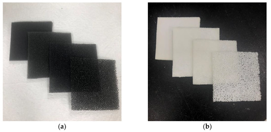 Polyurethane foam with pore densities of 25, 45, 60 and 80 PPI, as shown in Figure 1a, was used as a sacrificial polymer template. It was sintered at 1480 °C for 1 h to prepare the reticulated porous zirconia, as shown in Figure 1b. When manufacturing reticulated porous ceramics using the replica method, in order to obtain high compressive strength, it is important that the prepared ceramic slurry completely penetrates into the inside of the polymer template. For this reason, the rheological properties of ceramic slurry must be carefully considered when preparing reticulated porous ceramics. There are two considerations when optimizing the rheological properties of ceramic slurry. One is to adjust the properties of the raw materials, such as the particle size, shape, and fluidity of the ceramic powder, while the other is to control the type and content of any additives used, i.e., the binder, plasticizer, dispersant, and thickener, among others [15,16].