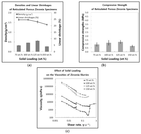(a) Density and linear shrinkage outcomes, (b) compressive strength, and (c) viscosity values of reticulated porous zirconia specimens with different solid loading rates of 75–150 wt.%.
