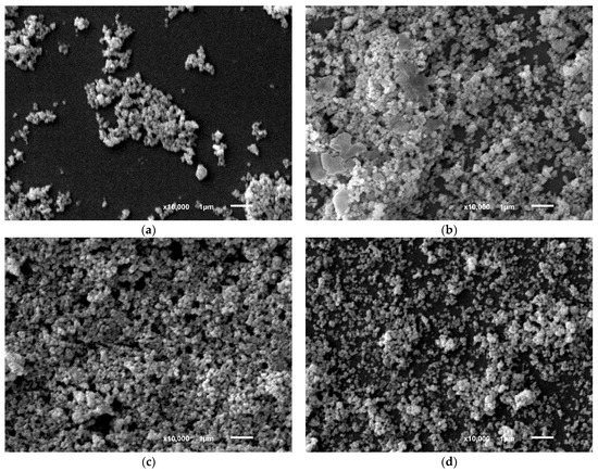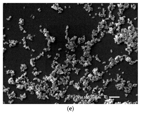 After fixing the solid loading level in the zirconia slurry to 100 wt.%, the effects of a change in the average particle size on the characteristics of the reticulated porous zirconia were investigated. When the number of particles in the ceramic slurry is constant, the viscosity of the ceramic slurry increases as the particle size becomes finer. Therefore, the authors attempted to utilize the ball-milling process to create a finer size and observed the effects of the particle size. The microstructures of the zirconia particles obtained with different ball-milling times of 0, 1, 4, 8, and 24 h are shown in Figure 3. The microstructure of the zirconia particles after ball-milling for 4 h shows an uneven particle distribution, but it was also noted that many particles approximately 0.5 µm or less in size are distributed throughout the specimen. Furthermore, an examination of the zirconia particles ball-milled for 24 h showed that the particle distribution is uniform and consists of spherical particles. These results indicate that the cohesion of the primary particle size of the raw material was reduced and that more uniform zirconia powder can be prepared using the ball-milling process.