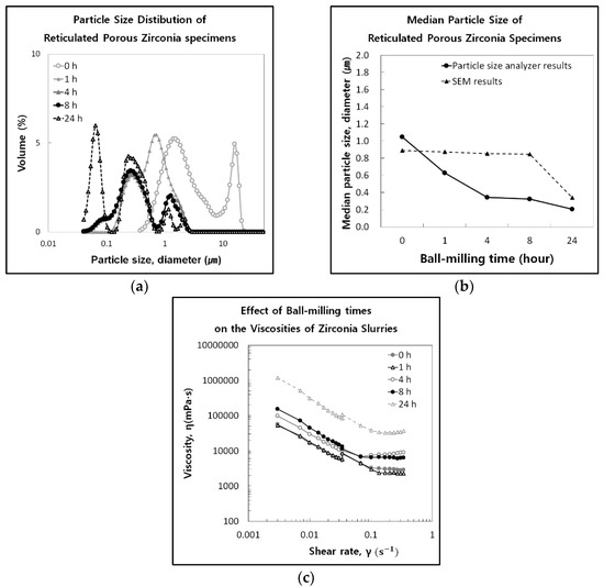 We confirmed that the viscosity increased as the particle size was decreased. With this in mind, the densities and compressive strength were measured, as shown in Figure 5a. As the particle size of zirconia was decreased, the density and compressive strength of the reticulated porous zirconia clearly increased. However, sharp decreases were noted when ball-milling for more than 24 h. This result is notable in that the highest density and compressive strength did not appear at the highest viscosity. What this result suggests is that the ceramic slurry, when created with a viscosity level past a certain point, deteriorates the density and compressive strength of reticulated porous zirconia. All things considered, the average particle size decreased after ball-milling for 24 h and the viscosity of the zirconia slurry increased above a critical point, indicating that a non-uniform coating could be formed. The pore size distributions of reticulated porous zirconia with a change in the particle size when ball-milled for 0, 1, 4, 8, and 24 h were observed, as shown in Figure 5b. For the reticulated porous zirconia using particles without the ball-milling process, the pore size was in the approximate range of 1 to 10 µm. However, for the reticulated porous zirconia prepared using zirconia ball-milled for more than 8 h, a pore size distribution of 1 to 10 µm was not observed. In this case, densification between the particles in the strut during the sintering process is likely to have arisen, resulting in the disappearance of pores in the range of 1 to 10 µm.