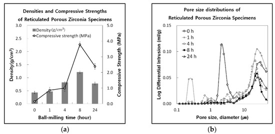 (a) Densities and compressive strength outcomes and (b) pore size distributions of reticulated porous zirconia specimen ball-milled for 0, 1, 4, 8, and 24 h.