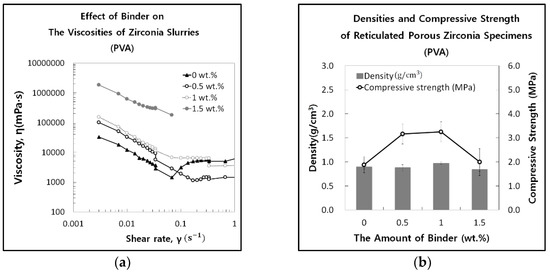 Effects of the addition of a binder (0–1.5 wt.% PVA) on the (a) viscosities, (b) densities and compressive strength, and the (c) pore size distribution of reticulated porous zirconia specimens.