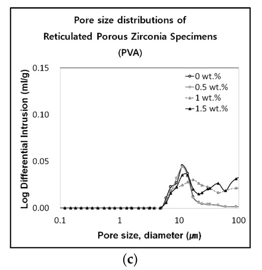 The second part of this study considered the optimization of additives in the zirconia slurry. Among the various types of additives in use at present, this study concentrated on the type and amount of a binder and a dispersant, which are known to affect the properties of ceramic slurries significantly. Normally, polyvinyl alcohol (PVA), which is often used as an organic binder in ceramic slurries, can cover on the surfaces of these particles to increase the bonding strength between the particles and improve the fluidity. However, because it is removed during heat treatment, when an excessive amount is added, voids may form between the particles, reducing the compressive strength after sintering [17]. Therefore, when PVA is used as an organic binder, optimizing the amount of PVA in the ceramic slurry is important. Figure 6a shows the viscosity of zirconia slurries prepared with 0~1.5 wt.% PVA. As the amount of added PVA in the zirconia slurry increases, the viscosity of the zirconia slurry increases. The density and compressive strength with different amounts from 0 to 1.5 wt.% PVA are shown in Figure 6b. When the added amount of PVA is 1 wt.%, the compressive strength of the reticulated porous zirconia is approximately 3.86 MPa. In contrast, the density of the reticulated porous zirconia remained constant even when the amount of added PVA increased. This result indicates that an increase in the amount of added PVA does not cause an increase in the applied mass, but it was judged that it had the effect of improving the densification by narrowing the distance between the particles. However, when the amount of added PVA was 1 wt.% or more, the compressive strength decreased. This result indicates that high viscosity due to an excessive addition of PVA results in poor compressive strength. Therefore, in this study, the amount of PVA in the zirconia slurry was fixed at 1 wt.%. The pore size distributions of reticulated porous zirconia specimens with changes in the amount of PVA are shown in Figure 6c. Regardless of the increase in the amount of added PVA, the pore size remained uniformly distributed, whereas the log differential intrusions were slightly decreased. These results indicate that the distance between the particles is narrowed, which is believed to have affected the densification.