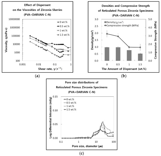 Effects of the addition of a dispersant (0–1.5 wt.% DARVAN C-N) on the (a) viscosities, (b) densities and compressive strength outcomes, and the (c) pore size distributions of reticulated porous zirconia specimens.
