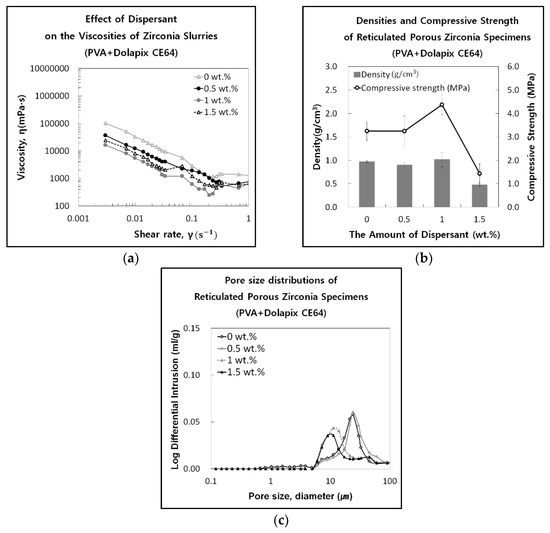 DARVAN C-N, an ammonium polymethacrylate solution, is completely soluble in water systems and is commonly applied in the electronics and in specific ceramics fields [18]. It produces slurries with exceptionally low viscosity levels without being prone to foaming. Dolapix CE 64, a carbonic-acid-based polyelectrolyte solution, is also dispersed in water and used in alumina [19], zirconia [20], and cordierite-based-glass ceramics [21]. Each dispersant was added in the range of 0–1.5 wt.% to determine the optimal amount in the zirconia slurry. Figure 7a shows the viscosity of the zirconia slurries prepared with 0–1.5 wt.% DARVAN C-N. Particles in the zirconia slurry are dispersed by electric repulsive force by adding DARVAN C-N; thus, as the amount of DARVAN C-N is increased, the viscosity of the zirconia slurry decreases gradually. However, because the distance between the dispersed particles at the same volume is limited, the viscosity did not decrease further, even when an amount of 1.5 wt.% of DARVAN C-N or more was added. The density and compressive strength of the reticulated porous zirconia specimens with different amounts of DARVAN C-N are shown in Figure 7b. In comparison, the density and compressive strength decreased as the amount of DARVAN C-N was increased. These results indicate a decrease in the viscosity in the zirconia slurry upon the addition of DARVAN C-N as a dispersant, with no effect on or increase in the compressive strength. The pore size distributions of the reticulated porous zirconia specimens upon the addition of DARVAN C-N are shown in Figure 7c. Regardless of the amount of DARVAN C-N, it is believed that the pore size distribution ranged from approximately 10 to 100 µm.