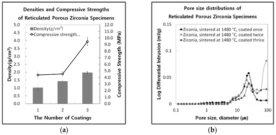 Three slurry coatings were used, and sintering was performed every time. Figure 9a shows the density and compressive strength of the reticulated porous zirconia specimens according to number of coatings, which ranged here from one to three. As the number of slurry coatings increases, the compressive strength of the reticulated porous zirconia is more than doubled from 4.37 to 9.43 MPa. One study concentrated on reticulated porous alumina with multiple slurry coatings applied. In that study, the compressive strength for a single coating was 0.07 MPa, and that after a triple coating it was 0.2 MPa [25]. This data showed a pore density of 10 PPI with sintering at 1400 °C. Although both the pore density and the sintering temperature were different in each case, it was noted that reticulated porous zirconia could more effectively enhance the compressive strength when using multiple slurry coatings as opposed to reticulated porous alumina.
