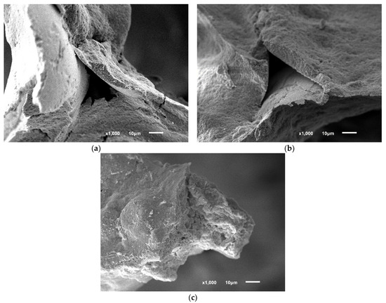 The log differential intrusion is also slightly decreased as the number of coatings increases. These results can be explained by examining the microstructure in Figure 10. The fractured strut microstructures of reticulated porous zirconia with (a) one coating, (b) two coatings, and (c) three coatings are shown in Figure 10. When coated once, fractured strut walls of reticulated porous zirconia formed thin triangular voids. These voids can significantly affect the compressive strength because the sample becomes brittle. When coated twice, the fractured strut walls of reticulated porous zirconia formed thick triangular voids, and when coated thrice, the internal voids were completely filled. It can be judged that these microstructures coincide with the results in Figure 9b, showing a decrease in the log differential intrusion outcome.