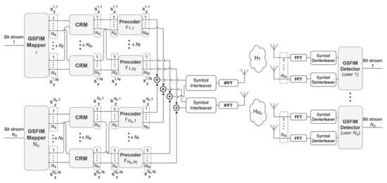 where and , with representing the precoder matrix. After the precoders and interleavers (which are explained further ahead), the frequency domain symbols are concatenated into N-sized blocks and converted to time domain through an inverse fast Fourier transform (IFFT). Before the transmission occurs, a CP with length greater than the delay spread of the channel is added to each block. It is important to observe that each PT-GSFIM symbol can carry a total of bits per user calculated through