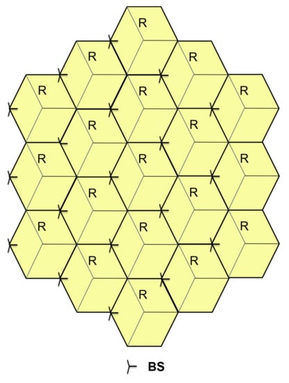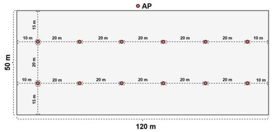 The indoor hotspot deployment scenario focuses on small coverage per cell and high user throughput or user density in buildings. This scenario represents indoor offices (InDs) with a total area of 120 m × 50 m. There are 12 small cells that are deployed with an ISD of 20 m. In this case, the BS antenna height is 3 m. The carrier frequency options are 30 and 70 GHz (mmWaves). The bandwidth for both 30 and 70 GHz carriers is up to 1 GHz. A total of 10 users per cell are distributed uniformly, and all users are indoors with 3 km/h velocity. Full buffer model is assumed. The layout of this scenario is illustrated in Figure 3. All parameters used correspond to the Table 7.2-2 in [36].