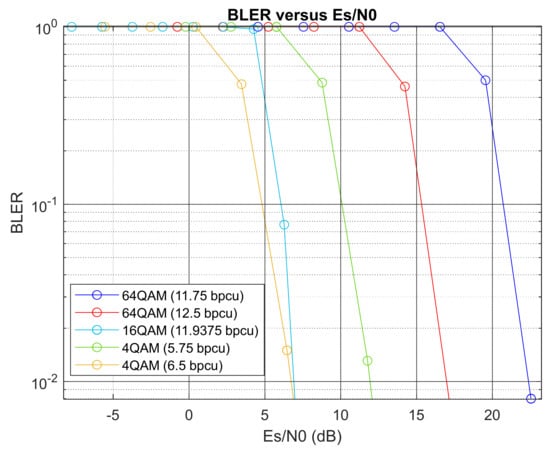 In Figure 5, BLER is presented versus () in dB for three cases of M-QAM modulations, namely M{4,16,64}. We have different SEs for 64QAM, namely 12.5 bpcu and 11.75 bpcu; for 16QAM, the SE is 11.9375 bpcu; and for 4QAM (QPSK), we have 6.5 bpcu and 5.75 bpcu. The difference between them is the number of transmitting antennas per user, which was 8 antennas per user for 64QAM (12.5 bpcu) and 4QAM (6.5 bpcu), 5 antennas per user for 64QAM (11.75 bpcu) and 4QAM (5.75 bpcu) and 12 antennas per user are used for 16QAM (11.9375 bpcu). As expected, higher values of M require higher values of to reach the reference BLER = 10−1. A higher number of antennas per user increases the bpcu and decreases the required to reach the reference BLER.