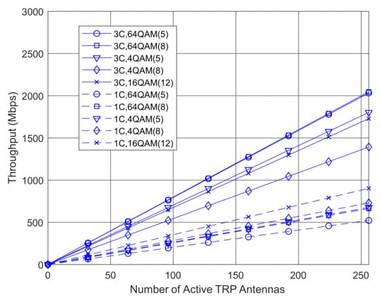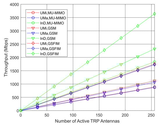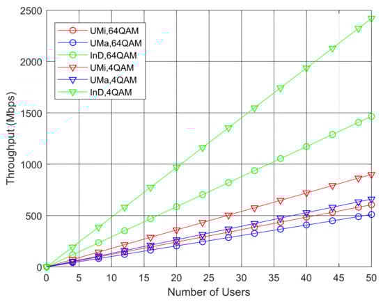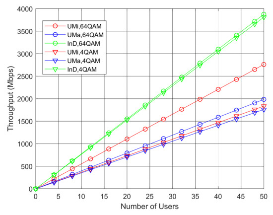 Based on the parameters of Figure 6, and noting that we considered Nu = 50, 5 transmit antennas per user Ntx = 5Nu and Nrx = 5 receive antennas per user, there are a total of 250 active antennas at each sector (one TRP per sector). 64QAM requires a higher SNR compared to 4QAM. InD is expected to offer the highest throughput due to its smaller size. This occurs independently of the modulation. UMi scenario assures the next best throughput performance, whereas UMa is the scenario with the lowest throughput. It is observed that the highest throughput performance is for InD with 4QAM-modulated packets. This is due to the InD scenario having twice the bit rate compared to the other scenarios. Moreover, InD has strong inter-interference and high propagation losses; however, most of the 4QAM packets are received correctly due to its required SINR being small. By contrast, most of the 64QAM packets are received with error because of its required SINR being high, resulting in lower average throughput. In other words, 64QAM packets are only correctly received close to the BS, while 4QAM packets are correctly received almost everywhere. Scenario UMi also has strong inter-interference between sites, and there is additional outdoor-to-indoor propagation loss for users that are inside the buildings. The throughput performance of 64QAM packets is lower than that of 4QAM packets in all scenarios. The explanation for this is the same given for the InD scenario. Scenario UMa also has strong inter-interference between sites, and due to the highest ISD, users at the cell borders suffer the smallest SINR. It also has additional outdoor-to-indoor propagation loss for users that are inside the buildings. As a consequence, the throughput performance of UMa is the worst of the three scenarios. In UMa, the throughput performance of 4QAM packets is slightly higher than that of 64QAM packets.