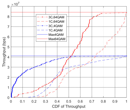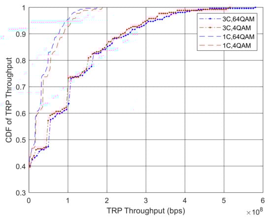 Figure 9 presents the CDF of a TRP for the UMa scenario serving 20 users, during the simulation run with a duration of 100 s. These statistics are based on the throughput performance of each one of all users measured at each TTI = 0.5 ms during the simulation run. When we compare the maximum throughput values of Figure 8 and Figure 9, we can see an increase of 14 for 4QAM and 7 for 64QAM. These numbers refer to 3C RAN clustering, confirming its lower inter-interference. In Figure 9, we can also observe the difference of 3 times more throughput achieved by RAN clustering 3C compared to the case of 1C. This occurs independently of the modulation. For 3C, there is a slight throughput gain of 64QAM-modulated packets compared to 4QAM packets. For 1C, there is a slight throughput gain of 4QAM packets compared to 64QAM. This corroborates the results of Figure 6 and Figure 7, for the value of Nu = 20.