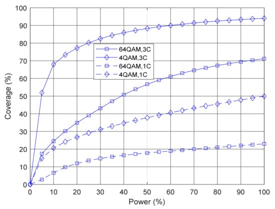 In Figure 14, we compare the coverage of C-RAN cluster sizes 1 and 3 for 64QAM and 4QAM, both with Ntx/Nu = 8. As expected, the coverage of modulation 4QAM is higher than the coverage of 64QAM, independently of the cluster size. We also observe that for 100% of transmitted power, the coverage gain of cluster size 3 (3C) compared to cluster size 1 (1C) is 1.9 for 4QAM and increases to 3.1 for 64QAM. Cluster size 3 increases especially the coverage of high-order modulations such as 64QAM modulation.