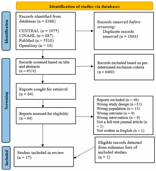 Initially, 8388 records were identified from database searches. After removing duplicates, 6524 records were screened based on titles and abstracts, and 6460 of these records were excluded according to pre-determined exclusion criteria. Finally, 64 records were examined based on the full -texts, and 17 randomised controlled trials (RCTs) [76,77,78,79,80,81,82,83,84,85,86,87,88,89,90,91,92] were included in this systematic review. The study screening and selection process is illustrated in a PRISMA 2020 flow diagram (Figure 1).
