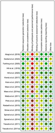 Risk of bias summary: review authors’ judgements about each risk of bias item for each included study. References for the studies in the table with the same publication year are Maeo et al. (2014) [83], Maeo et al. (2014a) [84], Yasuda et al. (2011) [91] and Yasuda et al. (2011a) [92].