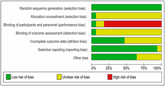 - Higgins, J.P.T.; Altman, D.G.; Gøtzsche, P.C.; Jüni, P.; Moher, D.; Oxman, A.D.; Savović, J.; Schulz, K.F.; Weeks, L.; Sterne, J.A.C. The Cochrane Collaboration’s tool for assessing risk of bias in randomised trials. BMJ 2011, 343, d5928. [Google Scholar] [CrossRef] [PubMed] [Green Version]