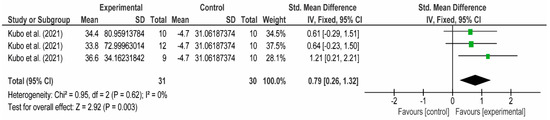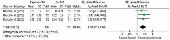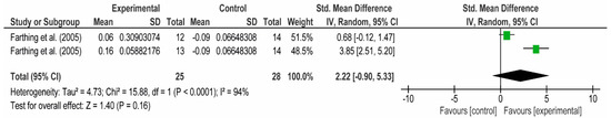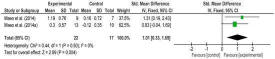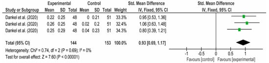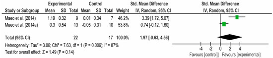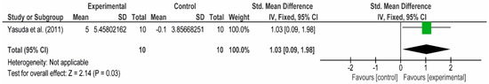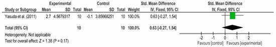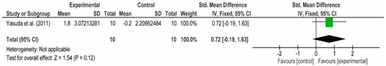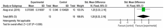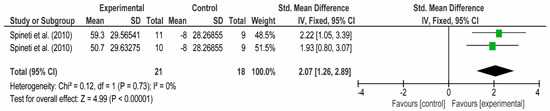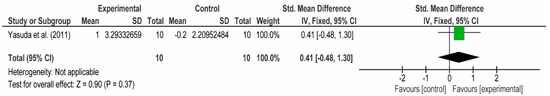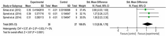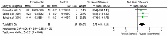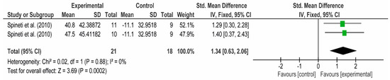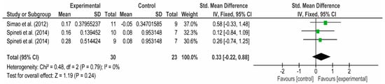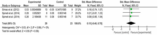 The heterogeneity of a meta-analysis was measured by the chi-squared (χ2 or Chi2) statistic and the level of heterogeneity was estimated by the I2 statistic, which indicates the percentage ratio of the variability in effect estimates caused by heterogeneity rather than chance [71]. I2 results were interpreted as low (25%), moderate (50%) and high (75%) [72]. When statistical heterogeneity was absent (p > 0.05 in the Chi2 statistics), a meta-analysis was performed for a continuous data, inverse variance, fixed-effect model [73] and a 95% confidence interval (95% CI). However, when statistical heterogeneity was observed, a meta-analysis was performed using a more conservative random effect model for continuous data, inverse variance and a 95% CI [73].
