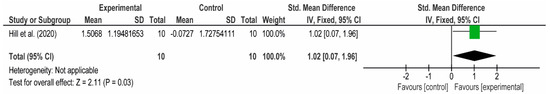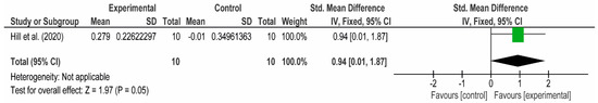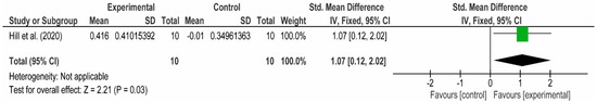 Meta-analyses of this review were conducted via the Review Manager computer program (RevMan 5.4.1) [55]. A non-training control of the placebo group was considered the comparator for this systematic review. RevMan automatically calculates Hedges’ (adjusted) g effects size (standardised mean difference (SMD)) using the mean difference (MD) from baseline and the standard deviation (SD) of these mean differences for exercise and control groups [56]. The difference between the Hedges’ g and Cohen’s d is the adjustments of Hedges’ g effect size calculations for a small sample having fewer than 20 participants [57]. Effect size interpretation was considered the commonly used interpretation for both Hedge’s g [58] and Cohen’s d [59] that small (0.2), medium (0.5) or large (0.8) [60].