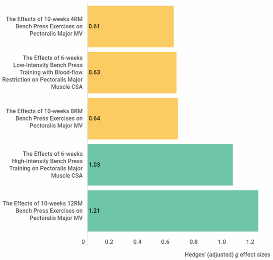 Ten weeks of 12RM resistance bench press training [82] showed a large effect on increasing the pectoralis major MV (g = 1.21 [0.21, 2.21]), whereas 10-weeks of 4RM and 8RM resistance bench press training [82] showed a medium effect on increasing the same parameter (g = 0.61 [−0.29, 1.51], g = 0.64 [−0.23, 1.5], respectively) (Figure 4). Overall, the bench press training showed a large effect (g = 0.79 [0.26, 1.32], LeO = low) on increasing the pectoralis major muscle volume. Six weeks of high-intensity bench press training [91] led to large increments in the pectoralis major muscle CSA (g = 1.03 [0.09, 1.98], LeO = very low) (Figure 5). Additionally, 6-weeks of low-intensity bench press training with BFR [91] led to medium increments in the pectoralis major muscle CSA (g = 0.63 [−0.27, 1.54], LeO = very low) (Figure 6).