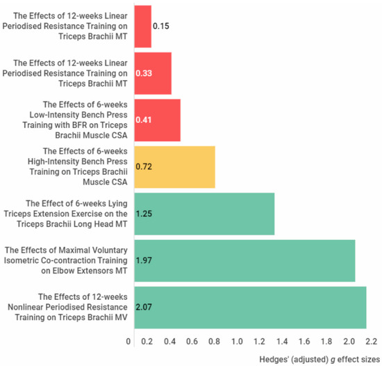 Six weeks of lying triceps extension exercise [76], which was performed via a dumbbell adjusted at 80% of 1 repetition maximum (RM), showed a large effect size (g = 1.25 [0.33, 2.16], LeO = moderate) to increase the triceps brachii long head MT (Figure 7). Six weeks of high-intensity bench press training [91] showed a medium effects size on increasing the triceps brachii muscle CSA (g = 0.72 [−0.19, 1.63], LeO = very low) (Figure 8). Six weeks of low-intensity bench press training with BFR [91] showed a small effect on increasing the triceps brachii muscle CSA (g = 0.41 [−0.48, 1.3], LeO = very low) (Figure 9). Twelve weeks of linear periodised resistance training [88,90] showed a trivial effect on increasing the triceps brachii MT (g = 0.15 [−0.40, 0.7], LeO = very low) (Figure 10). Twelve weeks of nonlinear periodised resistance training [88,90] showed a small effect on increasing the triceps brachii MT (g = 0.33 [0.56, 1.7], LeO = very low) (Figure 11). On the contrary, 12-weeks of nonlinear periodised resistance training [89] illustrated a large effect size on increasing the triceps brachii MV (g = 2.07 [1.26, 2.89], LeO = high) (Figure 12). The isometric maximal voluntary co-contraction training [83,84] (4 and 12 weeks of study duration combinations) showed a large effect on increasing the MT of the elbow extensors (g = 1.97 [−0.63, 4.56], LeO = moderate) (Figure 13).