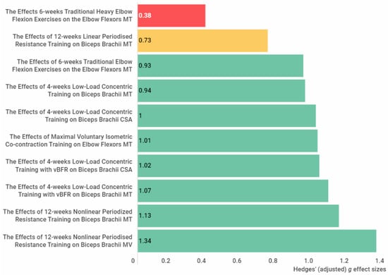Four weeks of concentric low-load (at 30% of concentric elbow flexion peak torque) forearm flexion-extension training with vBFR (40% of lowest pressure needed to restrict brachial artery) [79] showed a large effect size on increasing the biceps brachii MT (g = 1.07 [0.12, 2.02], LeO = low) (Figure 14), and on increasing the biceps brachii CSA (g = 1.02 [0.07, 1.96], LeO = low) (Figure 15). Additionally, 4-weeks of concentric low-load (at 30% of concentric elbow flexion peak torque) forearm flexion-extension training [79] showed a large effect size on increasing the biceps brachii MT (g = 0.94 [0.01, 1.87], LeO = low) (Figure 16), and on increasing the biceps brachii CSA (g = 1 [0.06, 1.94], LeO = low) (Figure 17). Twelve weeks of linear periodised resistance training [88,90] showed a medium effect on increasing the biceps brachii MT (g = 0.73 [0.18, 1.28], LoE = very low) (Figure 18). In contrast, 12-weeks of nonlinear periodised resistance training [88,90] showed a large effect on increasing the biceps brachii MT (g = 1.13 [0.56, 1.7], LeO = low) (Figure 19). Similarly, 12-weeks of nonlinear periodised resistance training [89] illustrated a large effect size on increasing the biceps brachii MV (g = 1.34 [0.63, 2.06], LeO = moderate) (Figure 20). Six weeks of traditional elbow flexion exercises [77] using a dumbbell showed a large effect size on increasing the elbow flexors MT (g = 0.93 [0.69, 1.17], LeO = high) (Figure 21), whereas heavy training [77] showed a small effect on the same parameter (g = 0.38 [0.15, 0.6], LeO = high) (Figure 22). Finally, the isometric maximal voluntary co-contraction training [83,84] (4 and 12 weeks of study duration combinations) showed a large effect on increasing the MT of the elbow flexors (g = 1.01 [0.33, 1.69], LeO = moderate) (Figure 23).