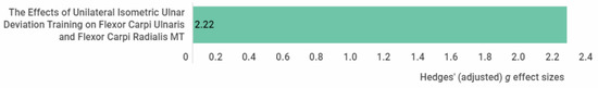 Six weeks of isometric ulnar deviation training [78] showed a large effect (g = 2.22 [−0.9, 5.33], LeO = very low) on increasing the flexor carpi ulnaris and radialis MT of the trained right and left hands (Figure 24).