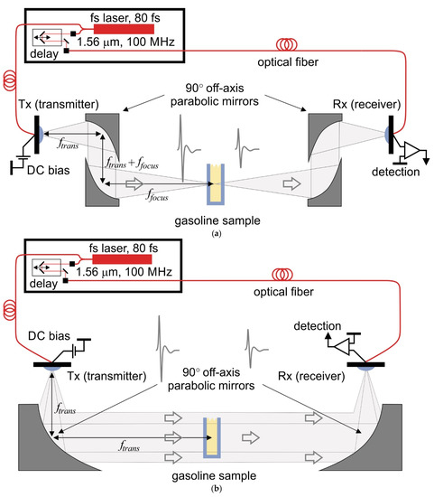 - Dietz, R.J.B.; Vieweg, N.; Puppe, T.; Zach, A.; Globisch, B.; Göbel, T.; Leisching, P.; Schell, M. All Fiber-Coupled THz-TDS System with kHz Measurement Rate Based on Electronically Controlled Optical Sampling. Opt. Lett. 2014, 39, 6482–6485. [Google Scholar] [CrossRef]