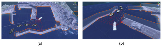 Definition (9) is the intensive learning content in the local space based on the navigation time schedule for autonomous ships and is provided sequentially. The autonomous ship stands by for the port entry of neighboring ships or remains right in the waterway depending on the complexity of the marine traffic environment configured with neighboring ships in the harbor. It comprises the movement to a final destination to avoid moving fishing boats in coastal waters (Angler’s boats frequently move around, marine sports zones are small, and fast boats move around). The inward voyage was implemented in reverse order.