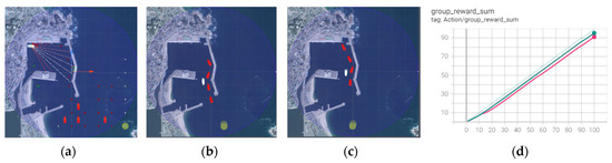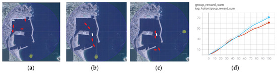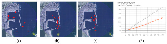 Section 4.5 was performed. Based on the successful arrival rate to waypoints, learning was completed only after approximately 3400 episodes. Furthermore, because intelligent neighboring ships sailed using a multi-agent RL algorithm, a slight difference was always generated in the gaps between ships and actions. The autonomous ship could obtain sufficient learning data from such changes and sailed to the right among outward ships or standby ships in a complicated marine traffic environment. Even when the autonomous ship waited in the harbor, neighboring ships sailed as a reaction against the autonomous ship. Thus, the autonomous ship can learn how to properly wait in the harbor for departure.