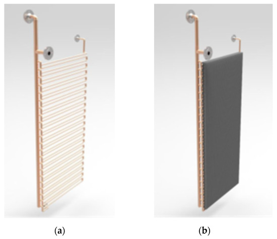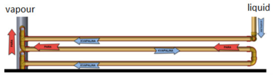 The task of the condenser is to receive the heat flux transferred from the evaporator and dissipate heat to the surroundings. It is a finned tube heat exchanger consisting of a distributor, collector, pipelines, and fins. The distributor, collector, and pipeline are made from copper, and the fins are made from aluminum. The distributor consists of one horizontal pipe with a diameter of 35 mm placed at the backside on the top of the condenser. The collector consists of one horizontal pipe with a diameter of 15 mm placed at the backside on the bottom of the condenser. The distributor and condenser are connected in 26 places by pipelines consisting of 10 pipes with diameters of 15 mm placed horizontally on top of each other in the shape of a meander. The goal of the condenser design was to ensure uniform distribution of the working fluid along the condenser with minimal pressure losses. Figure 4 shows the working fluid distribution in the condenser. The heat exchange surface of the heat exchanger is enlarged by 88 aluminum fins with dimensions of 650 × 300 × 0.25 mm and a spacing of 2.5 mm. The total condenser dimensions are 730 × 300 × 250 mm. The total volume of the condenser is 13.5 L. The outer heat exchange area of the condensing part of the heat pipe is 29.95 m2. The inner surface of the condenser is 3.2 m2.