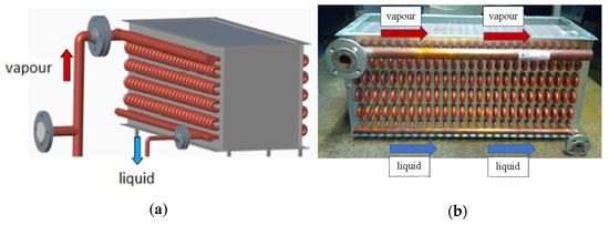 The task of the evaporator is to remove heat from the interior of the electric enclosure and to deliver it into the condenser by means of the vapors of the working medium flowing in the evaporator distributor. It is a finned tube heat exchanger, as shown in Figure 2. It consists of a pipeline, distributor, and fins. The pipeline and distributor are made from copper, and the fins are made from aluminum. The pipeline consists of 32 pipes with a diameter of 15 mm placed horizontally on top of each other in the shape of a meander. The distributor consists of one vertical pipe with a diameter of 35 mm with connections on each horizontal pipe. The heat exchange surface of the heat exchanger is enlarged by 265 aluminum fins with dimensions of 1650 × 50 × 0.25 mm and a spacing of 2.5 mm. The total dimensions of the evaporator are 1750 × 730 × 50 mm. The total volume of the evaporator is 4.9 L. The external heat exchange area of the evaporating part of the heat pipe is 42 m2. The inner surface of the evaporator is 0.94 m2.