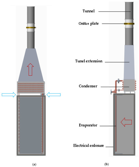 The enclosure dimensions are 2000 × 850 × 600 mm. The arrows in Figure 5 showed the airflow direction through the condenser and inside the electric enclosure. The evaporation part of the heat pipe was located in the interior of the electrical enclosure, where it receives heat, and the condensation part was placed above the electrical enclosure, where it dissipates heat to the ambient atmosphere. The distance between the evaporator and condenser is 30 mm. This configuration ensures the proper function of a gravitational loop heat pipe that uses the gravitational force for working substance circulation. Temperature sensors placed inside the electric enclosure give us data about interior temperature. The measuring part consists of a tunnel with temperature and pressure sensors, orifice plate and tunnel extension. The tunnel diameter is 160 mm, and the total length is 1000 mm. The orifice is placed in the middle of the tunnel. The diameter of the orifice throttle element is 60 mm. Mass airflow was measured in the tunnel. Temperature sensors placed under and above the condenser provided data to determine the heating power of the cooling device.