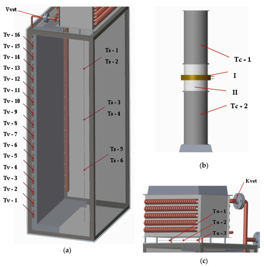 The layout of the temperature and pressure sensors is shown in Figure 6. Inside the cabinet were temperature sensors located on the individual bends of the evaporator tubes, marked Tv-1 to Tv-16. Their task was to record the temperature, which provided information about the flow of the working medium in the evaporator. To control the interior temperature, sensors Ts-1 to Ts-6 were placed in the lower, middle and upper part of the cabinet. Temperature sensors marked Tk-1 to Tk-9 were placed on the condenser. They were used to control the flow of the working medium in the condenser. Temperature sensors To-1 to To-3 were placed below the condenser to record the temperature of the air entering the condenser. Two temperature sensors were placed in the tunnels in front of and behind the orifice plate to record the outlet temperature of the air from the condenser. Two pressure sensors were placed in front and behind the orifice throttle element for the determination of air velocity from pressure differences.
