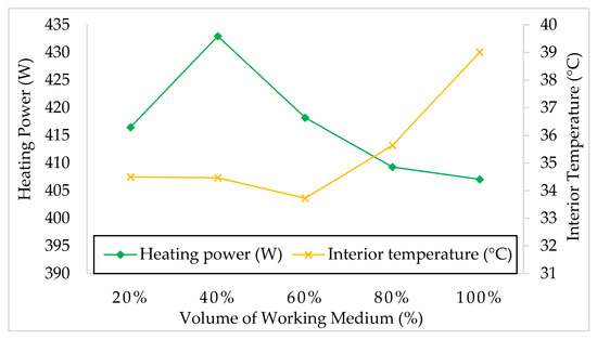 Figure 7 shows the results of heat transfer by means of a loop thermosiphon, the evaporating part of which was loaded with a simulated heat of 500 W from electrical resistance bodies. The analysis of the results showed that the cooling device removed heating power in the range of 433–407 W with an average value of 415 W and average operating temperature inside the electrical enclosure in the range of 33.5–39 °C at all investigated volumes of working medium. In terms of power dissipation to the environment, no dependence of the effect of the amount of working fluid in the evaporator was observed. From the point of view of the temperature in the interiors of the cabinet, it can be stated that at a volume of 100%, the temperature was significantly higher than at a volume of the working substance in the range of 20–80%. The best result was obtained with a working medium amount of 40% when the cooling system removed a heating power of 432 W from the electrical enclosure and the average operating temperature inside the electrical enclosure reached 34.5 °C.